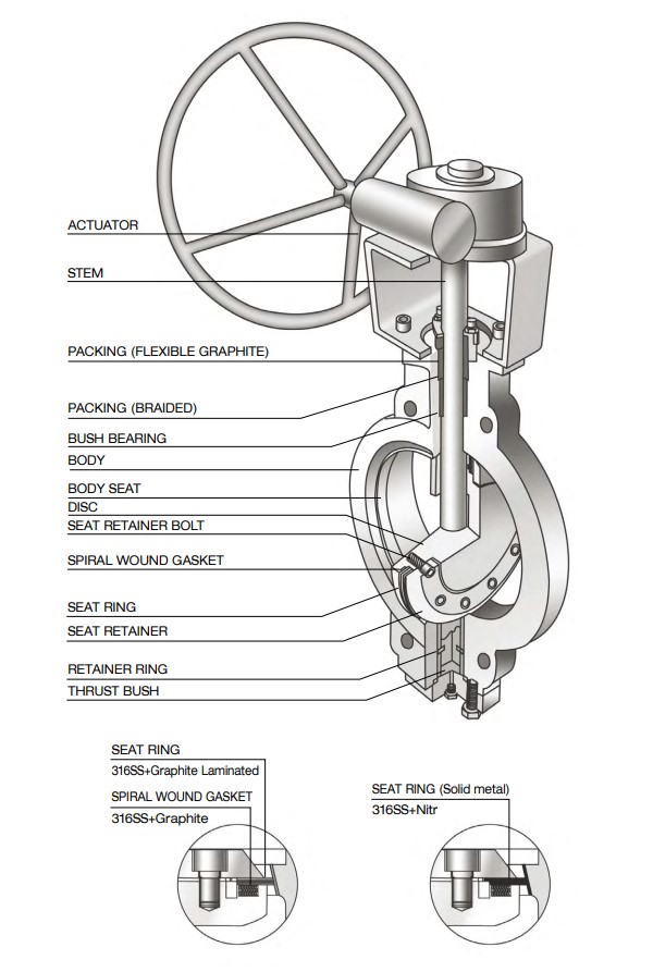 • The valve disc shall be the same material as the valve body. It is supported by laminated seal ring, which is kept in place by seat retainer ring bolted to the disc and can be replaced easily.