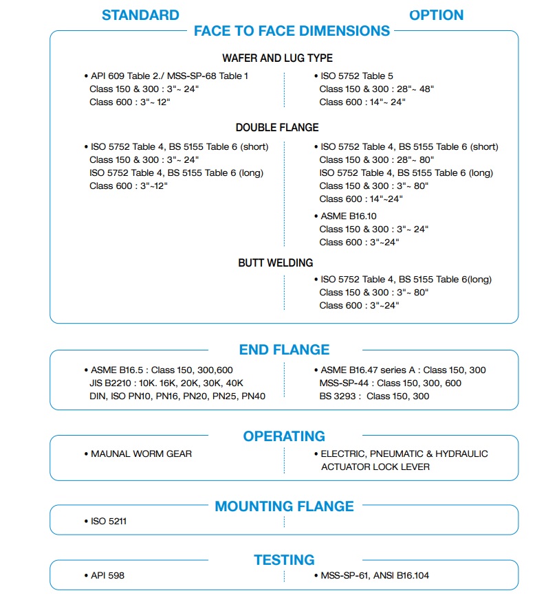 • Unrestricted selection of face to face dimensions for API, ASME(ANSI), BS, ISO, etc. and perfect interchangeability of gate, ball, plug, high performance butterfly, and other VALVE.